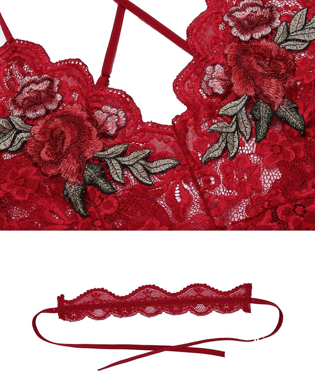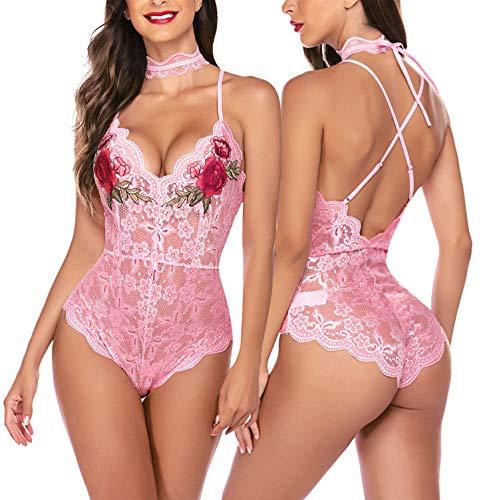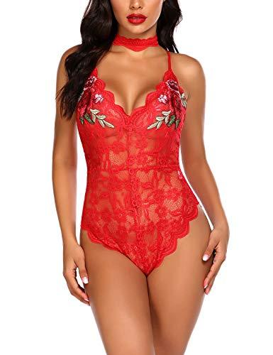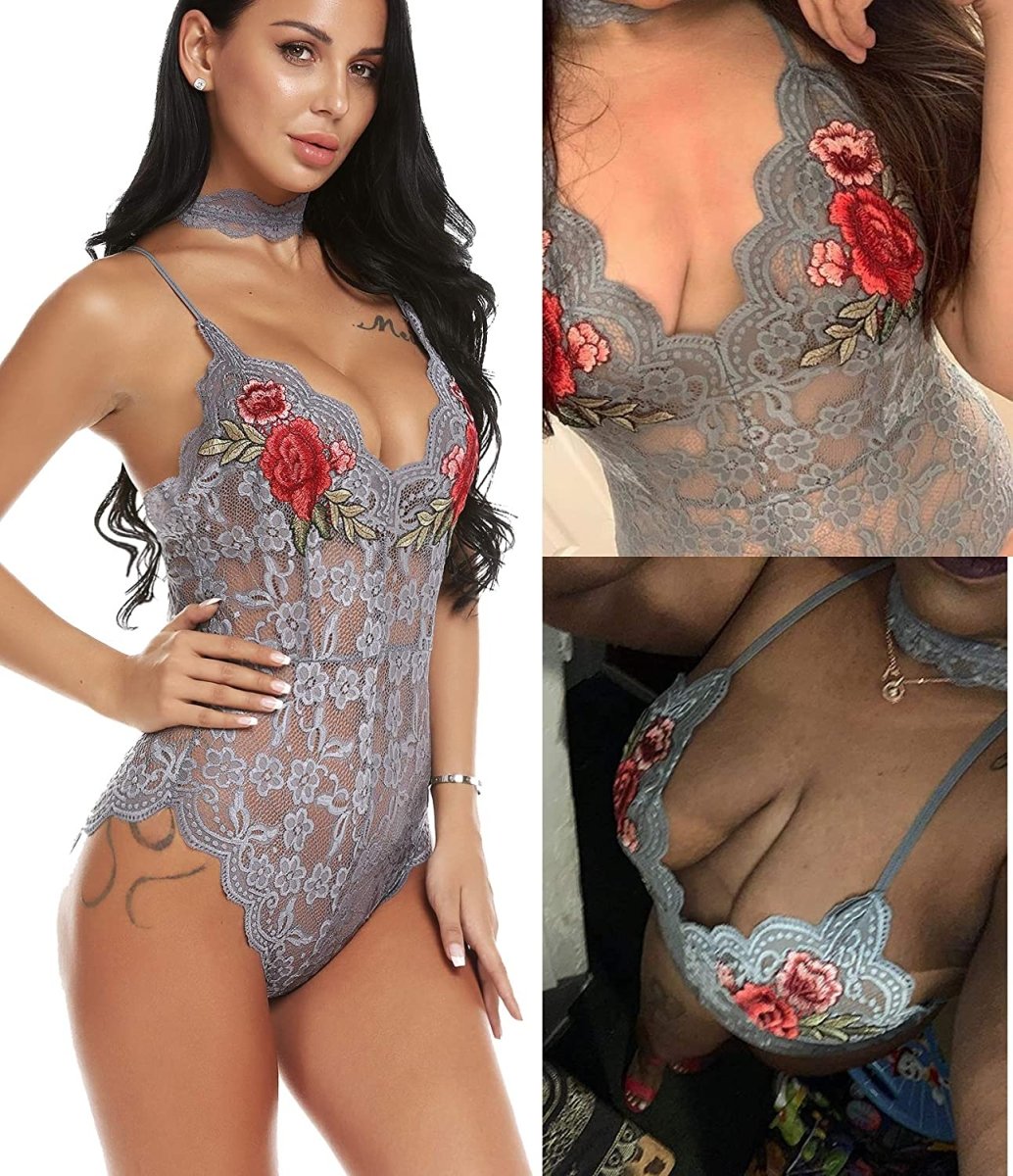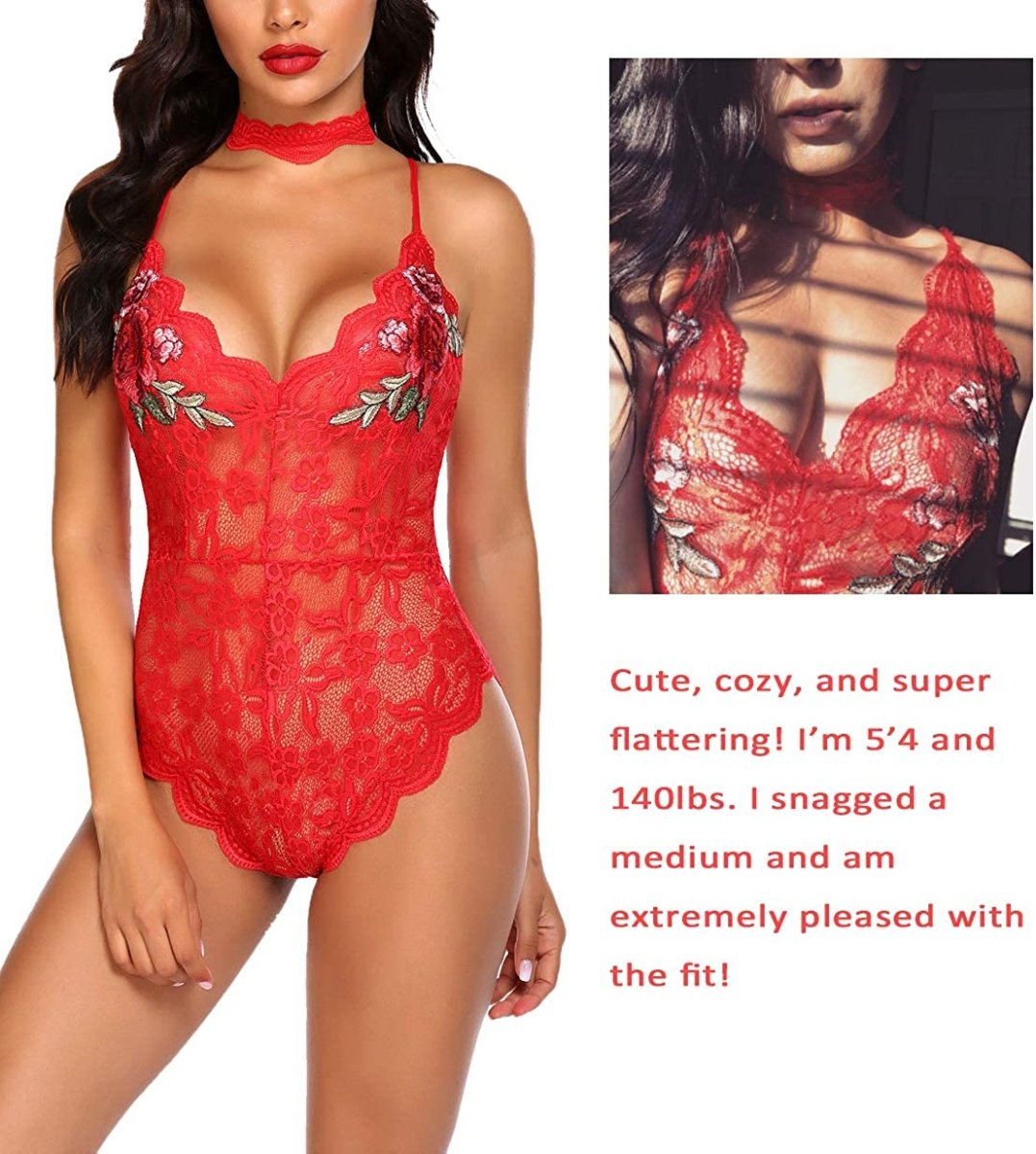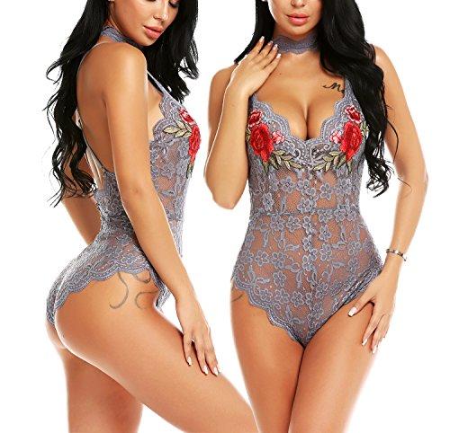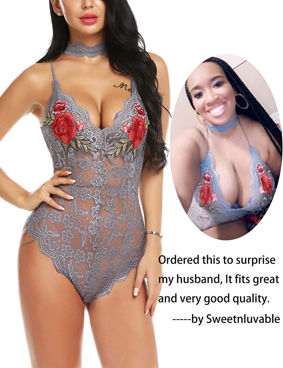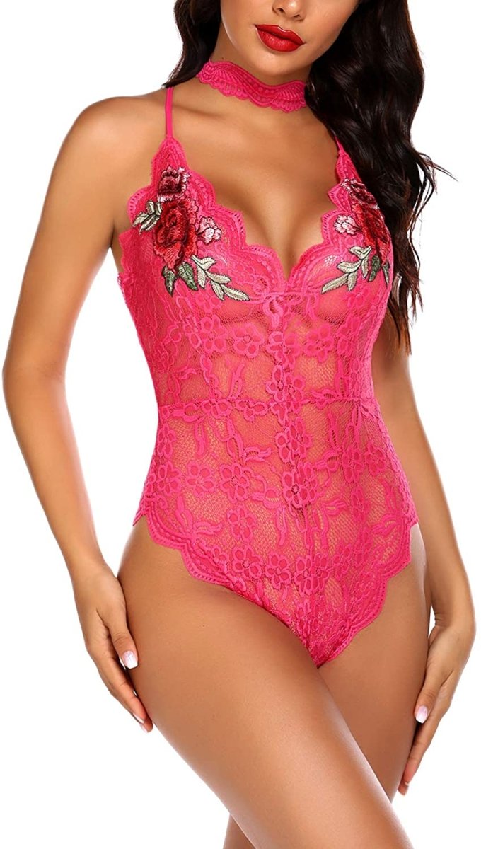 - Unique Styles --- Choker lingerie bodysuit; Embroidered rose applique lace teddy lingerie; one piece lingerie teddy babydoll bodysuit; scalloped deep v lingerie one piece for women