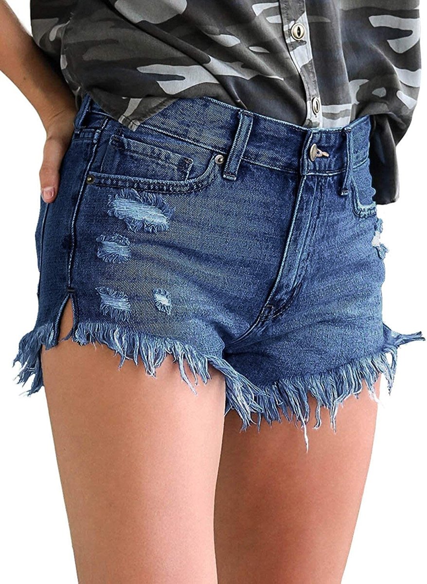 - Casual summer hot pants features high waist,frayed detailing and raw hemline. Slightly side slit.