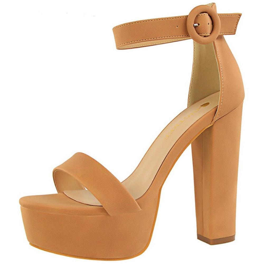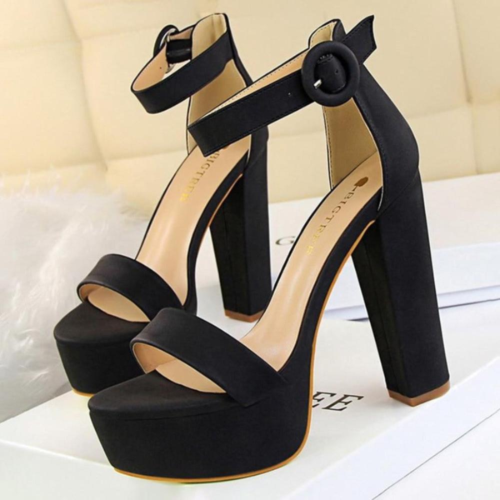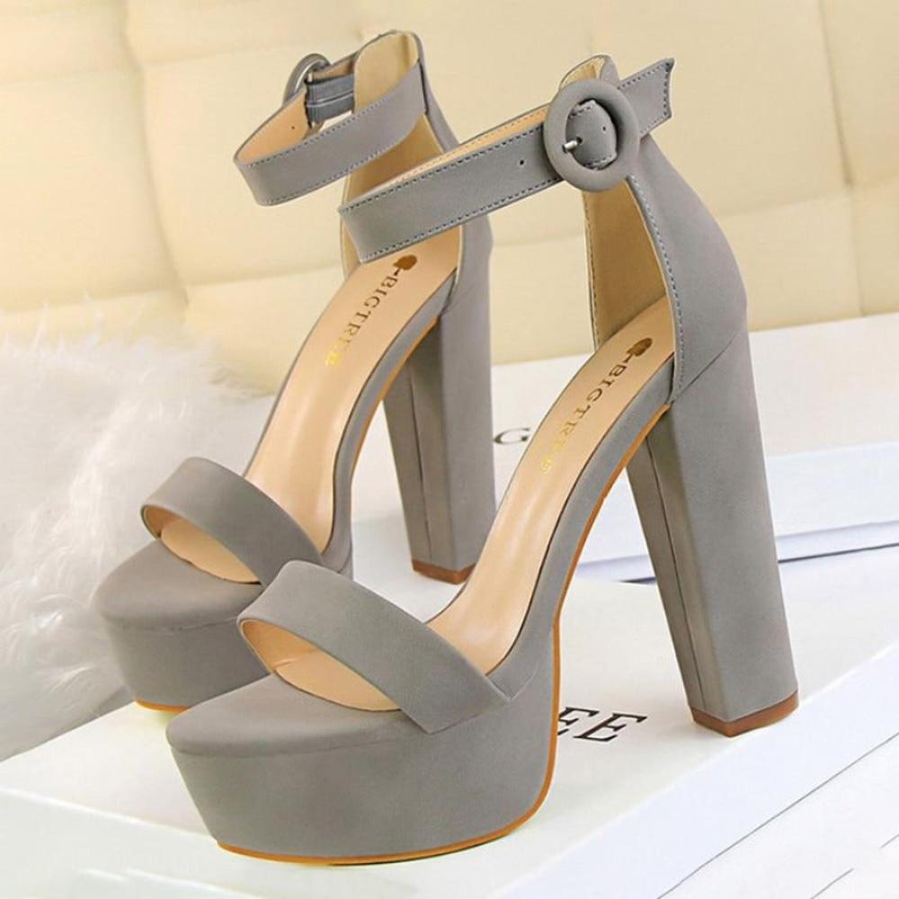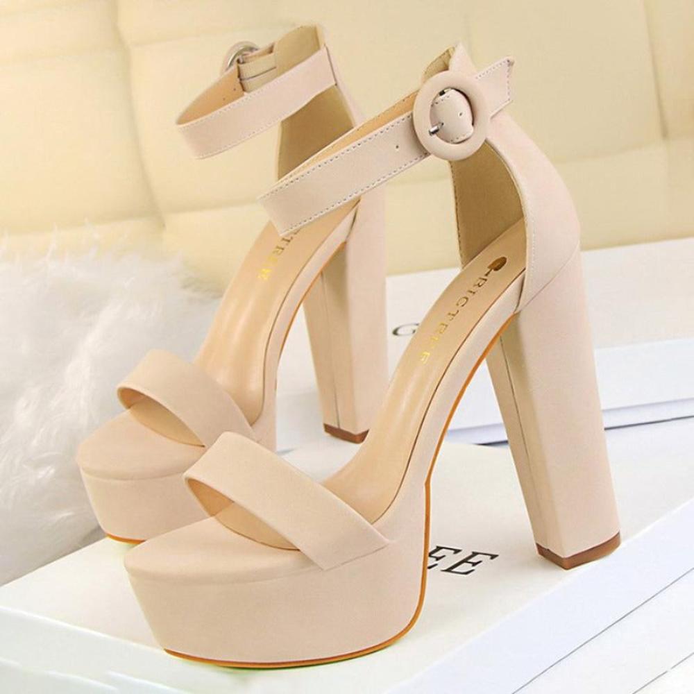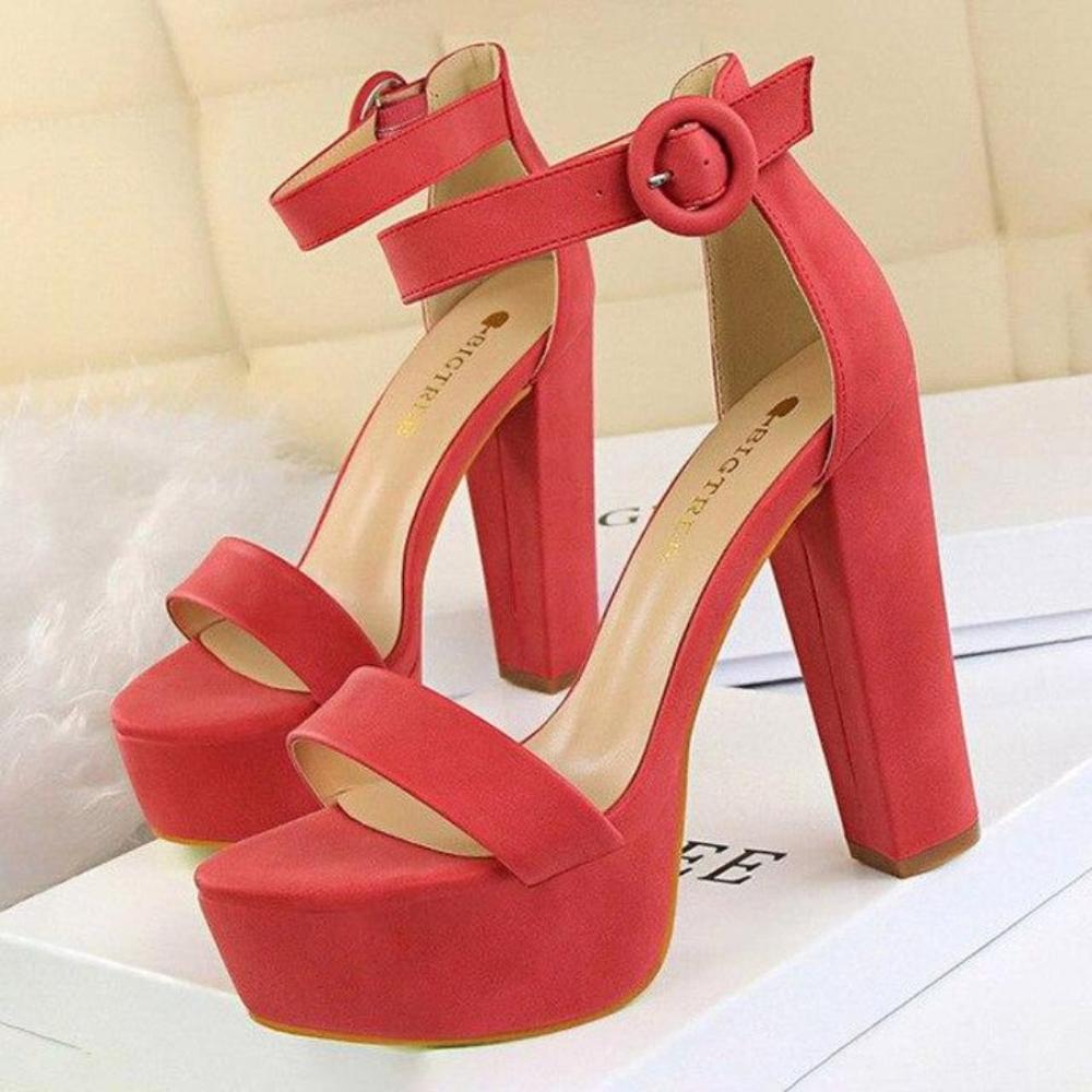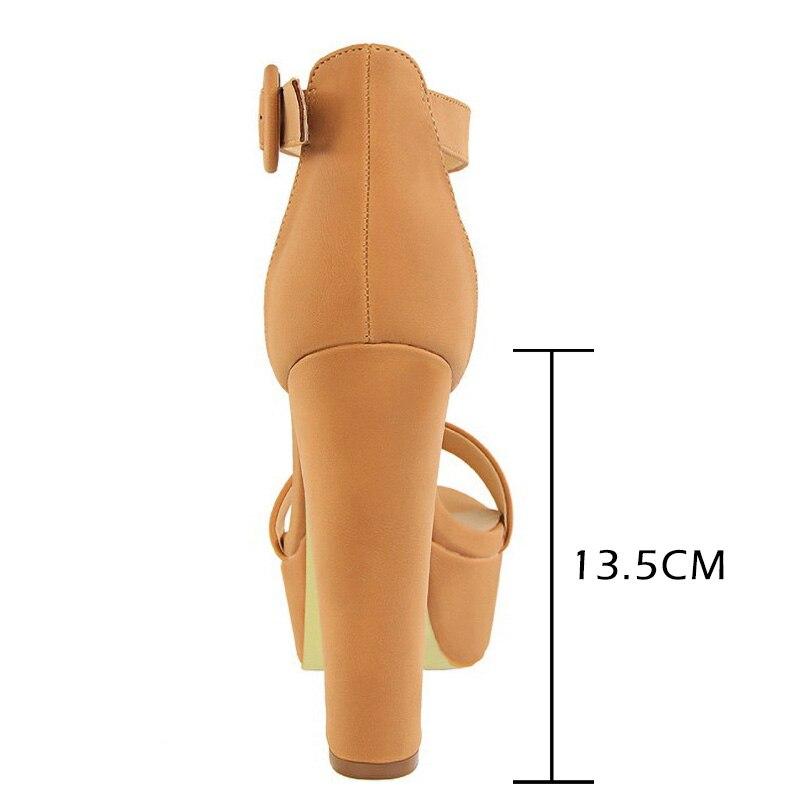 The 8cm square heel adds height, while the buckle strap closure provides a secure fit. The 3-5cm platform and peep toe design add a touch of elegance.
