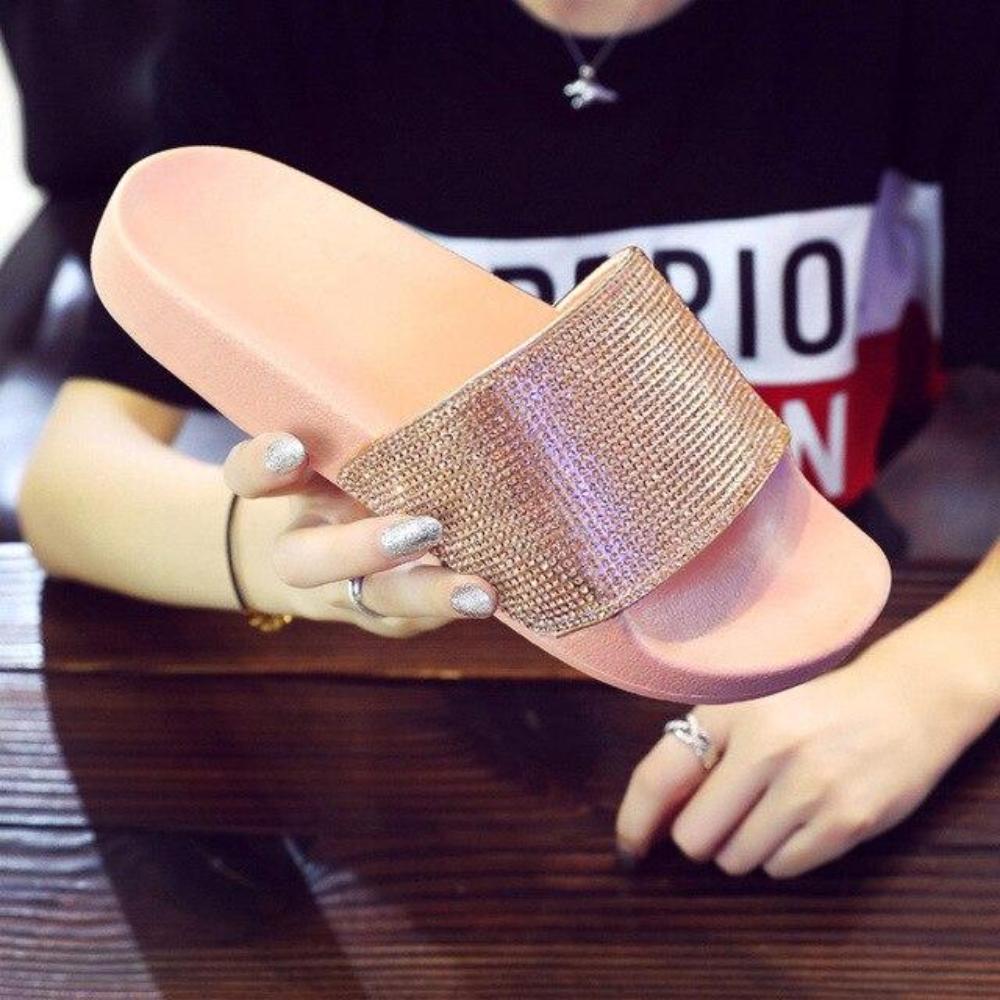Designed with a low heel for comfort and a rubber outsole for durability, these crystal diamond slides add a touch of elegance to any outfit.