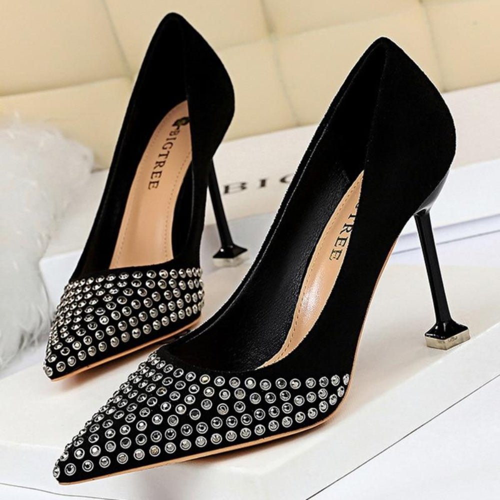 From the perspective of an industry expert, these Rivet Rhinestone Suede High Heels Women Pumps are the perfect addition to any spring or autumn party outfit.